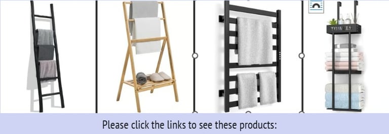 · 6ft Black Rustic towel ladder · 43” Freestanding Towel rack w/ storage shelf · Wall-mounted Black Towel Heating rack · Over the Door Towel Rack w/ shelf basket