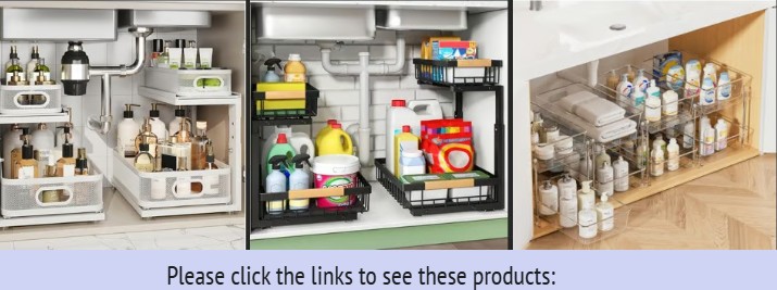 · 2pk White Under-sink Organizer w/ slides · 2pk Black Under-sink Organizer pull outs · 4pk Clear Under-sink/Countertop Vanity pull out bins